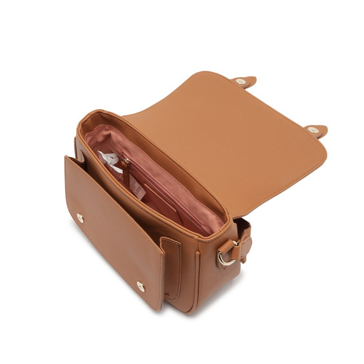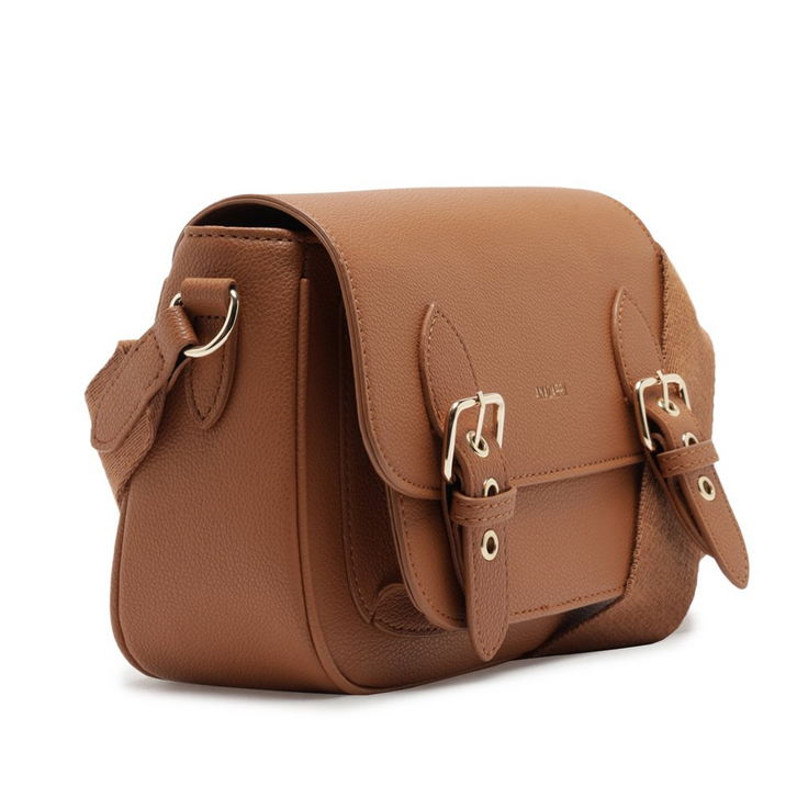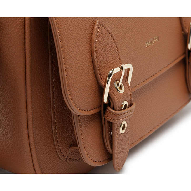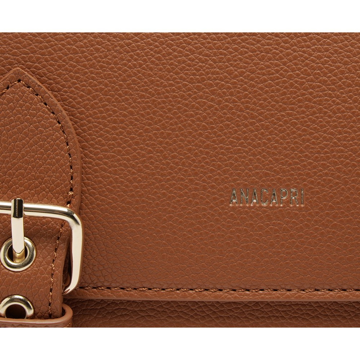 Bolsa tiracolo média, com detalhe em fivelas, na cor marrom. O modelo possui shape estruturado e retangular. Traz alça longa transversal e regulável mais larga, em fita de gorgurão, com fecho no tampo, por botão de ímã. Detalhe para divisória grande aberta, no interior do tampo frontal. Traz forro especial colorido na parte interna, etiqueta emborrachada com a frase personalizada Anacapri: “leve a vida numa bolsa”, com bolsinho de fecho em zíper com puxador em tira fina. Possui aplicação de lapelas de enfeite nas extremidades da capa frontal, com tiras mais largas com maxi fivelas imponentes. Contornada por costura pesponto delicada em toda a peça, traz assinatura Anacapri em carimbo metálico, centralizada na parte superior do tampo.