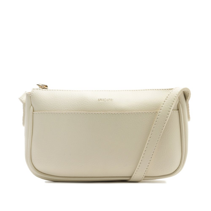 Bolsa tiracolo pequena, com bolso externo, na cor branca. De material similar ao couro com efeito texturizado, o modelo tem shape retangular com visual alongado, acabamento arredondado nos cantos e contorno por tira bombada. Traz alça longa e fixa com regulagem. Possui fecho superior em zíper metálico, com puxador em tira. Com forro na parte interna, traz aplicação de maxi etiqueta emborrachada Anacapri. Apresenta bolso externo aberto, contornado em pespontos delicados, com assinatura Anacapri em carimbo metálico, centralizada na parte superior da capa frontal.