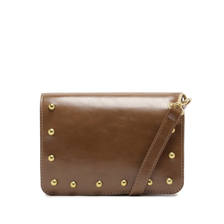 Bolsa tiracolo pequena, com aplicação de studs, na cor marrom. O modelo vem para a temporada com shape retangular e estruturado - estilo carteiro. No tamanho P, de material similar ao couro, possui detalhe de acabamento em pintura a fio, na cor vermelha. Traz alça longa regulável e removível - com detalhe em mosquetão metálico para regulagem, podendo ser utilizada como crossbody ou baguete. Com fecho no tampo, por botão de ímã, traz aplicação de studs metálicos redondos, no contorno da capa frontal.