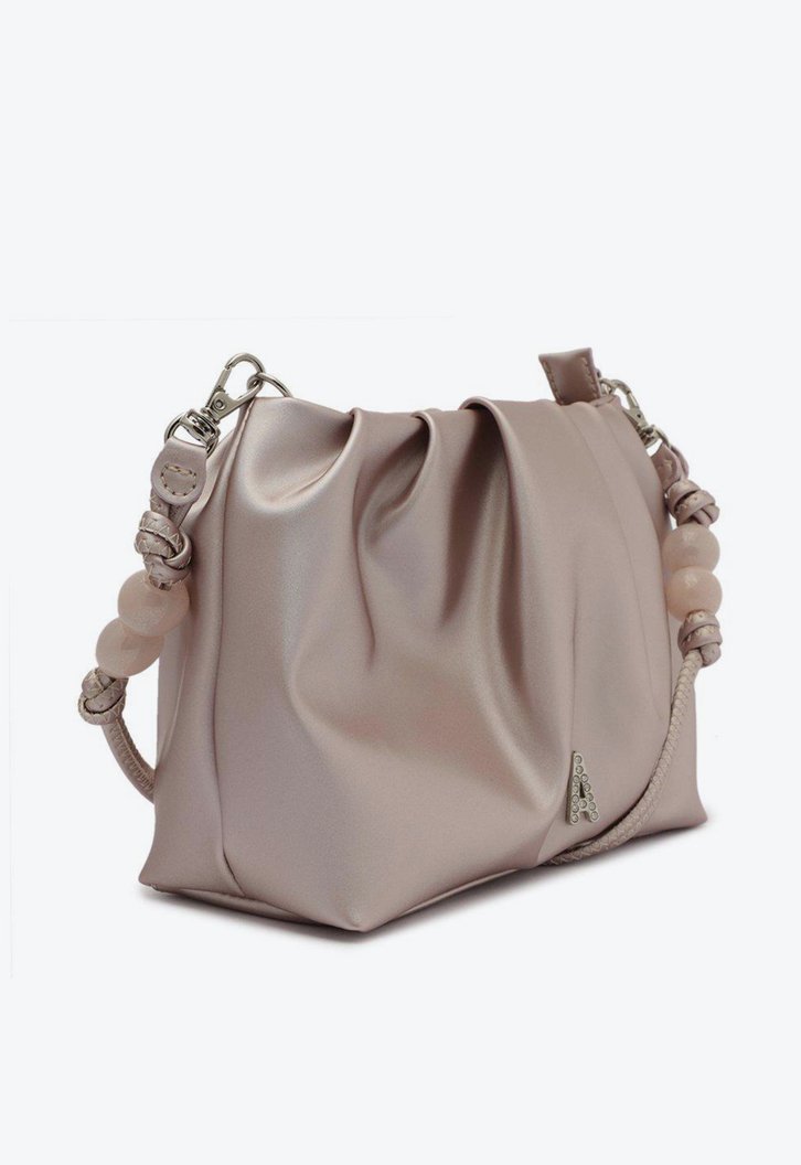 A bolsa tiracolo Anacapri de tamanho pequeno rosa claro é feita em cetim, com alça longa regulável e removível, efeito drapeado e aplicação de esferas translúcidas na alça.