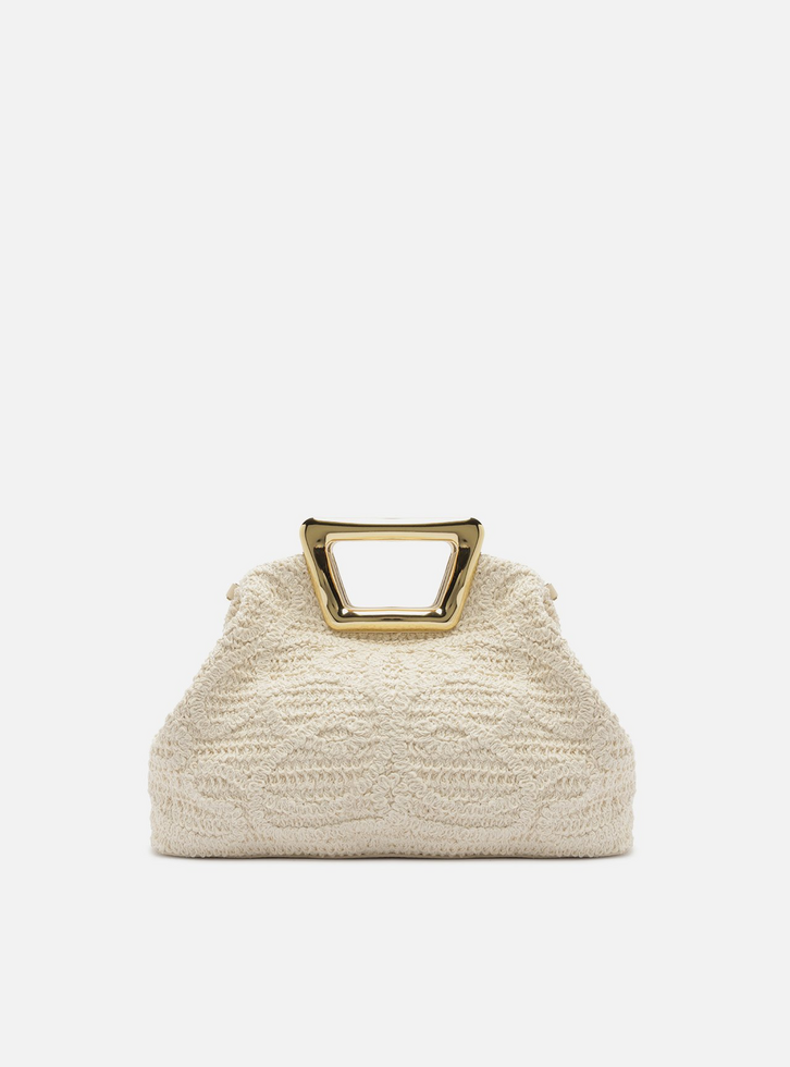 Bolsa tiracolo média off-white em couro. O acessório tem formato alongado, macio e maleável. Traz capa frontal em tecido com bordado e alça lateral fina, regulável e removível. Possui alça de mão metálica geométrica, incorporada ao corpo da bolsa, e fecho superior em imãs internos. Pode ser usada também como clutch. Parte interna forrada.