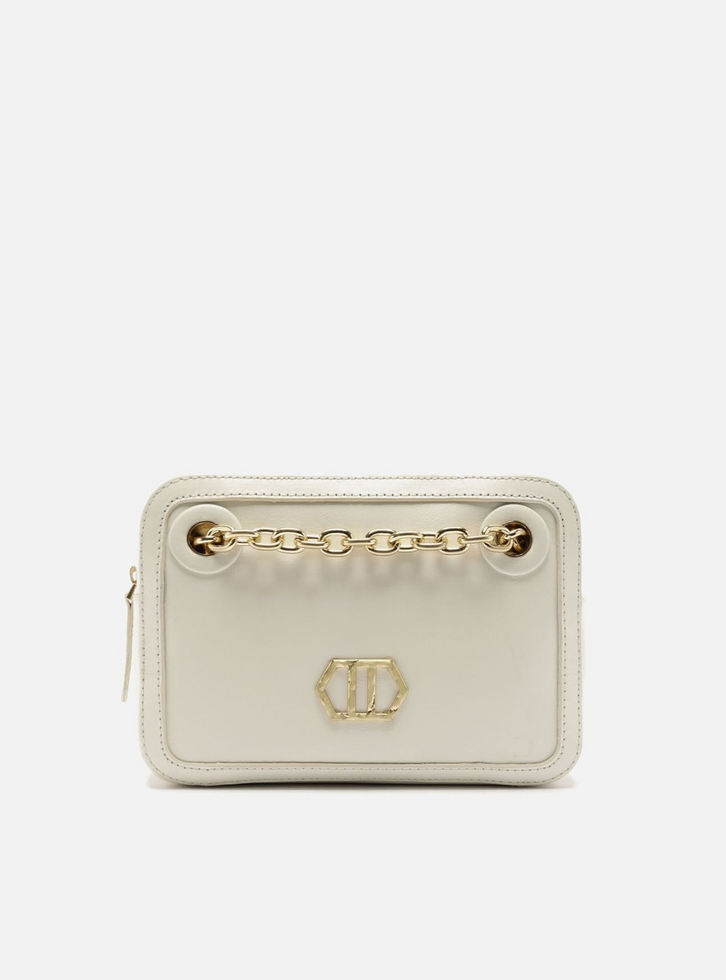 Bolsa feminina tiracolo média em couro off-white com efeito desgastado. O acessório tem formato quadrado e estruturado, com acabamento levemente brilhante. Possui fecho superior em zíper e alça em tira de couro e corrente metálica, que passa pela capa e interior, saindo na parte traseira por ilhoses. Conta com moldura e detalhe frontal em metal geométrico vazado.