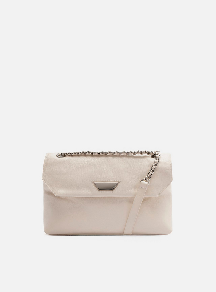 Bolsa tiracolo média de couro off white. O acessório tem formato estruturado. Traz alça lateral em corrente metálica com tira de couro transpassada. Possui fecho em tampo frontal com laterais recortadas e detalhe em metal geométrico com nome da marca.