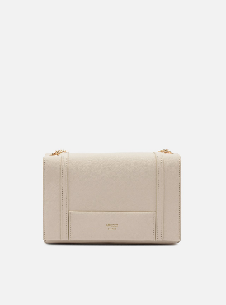 Bolsa tiracolo média off white. O acessório tem formato estruturado e retangular. Possui alça longa lateral em correntes, com ombreira, além de fecho em tampo frontal com detalhe do nome da marca.