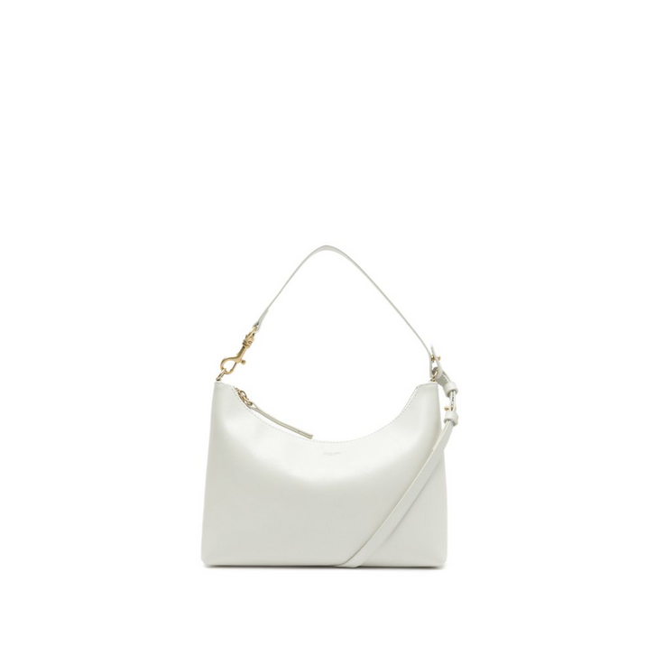 Bolsa tiracolo pequena, com alça removível, na cor branca. O modelo vem para a temporada com shape meia-lua. No tamanho P, de material similar ao couro, com efeito natural e texturizado. Traz alça de ombro fixa e uma alça transversal, regulável e removível. Apresenta forro interno especial em vermelho e fecho superior por zíper. Traz detalhe imponente na alça de ombro, com aplicação de mosquetão metálico em banho especial, com engate estilo gancho. Com assinatura Anacapri em baixo relevo, centralizada na parte superior da capa frontal.