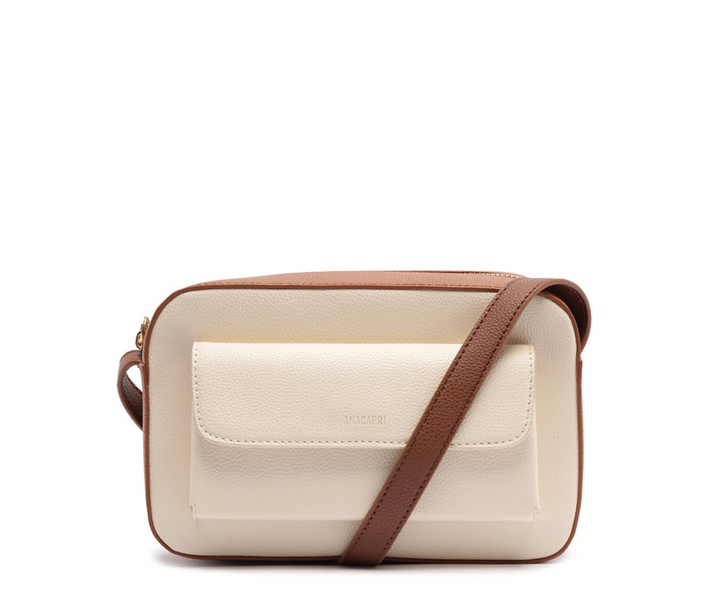 Bolsa tiracolo pequena, com detalhe de bolso frontal, branca e marrom. O modelo vem para a temporada com o shape best seller: retangular e estruturado, com laterais arredondadas. De material similar ao couro, com acabamento texturizado e detalhe de costura a fio nos contornos. Traz alça longa transversal e confortável com regulagem. Possui fechamento superior em zíper e bolsinho interno. Traz bolso flat externo grande - aplicado na capa frontal - com fecho no tampo, por botão de ímã e assinatura Anacapri em relevo, centralizada na parte superior do bolso frontal.