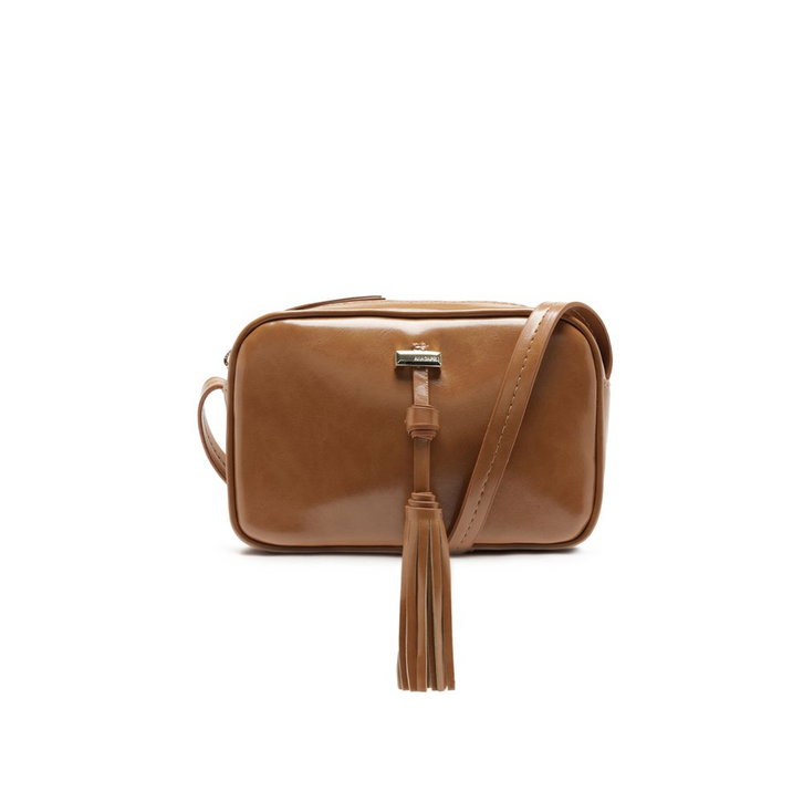 Bolsa tiracolo pequena, com detalhe em tassel, na cor marrom. A bolsa traz shape arredondado - estilo camera bag - com detalhe em contorno por tira bombada por toda a capa frontal. De material similar ao couro, com efeito envernizado, possui alça longa transversal e regulável, com acabamento a fio. Forrada, apresenta fecho superior em zíper metálico, com puxador em tira fina. Traz aplicação de adorno com barbicacho, com detalhe de acabamento com passante metálico personalizado Anacapri, centralizado na capa frontal.