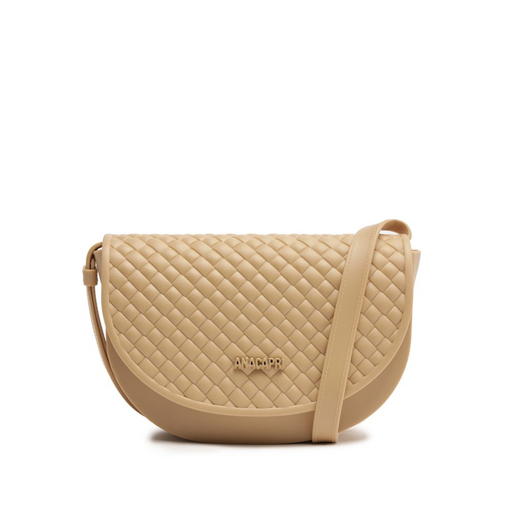 Bolsa tiracolo pequena injetada e texturizada, na cor bege. O modelo em PVC fosco possui shape estilo meia-lua e estruturado. Traz alça longa transversal com regulagem, podendo ser utilizada como tiracolo ou pochete. Com fecho no tampo, por botão de ímã, apresenta detalhe texturizado. Traz aplicação de pin metálico com assinatura Anacapri centralizada na parte inferior do tampo, na capa frontal.