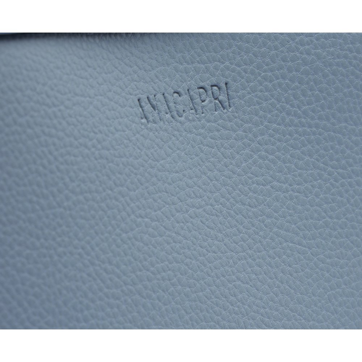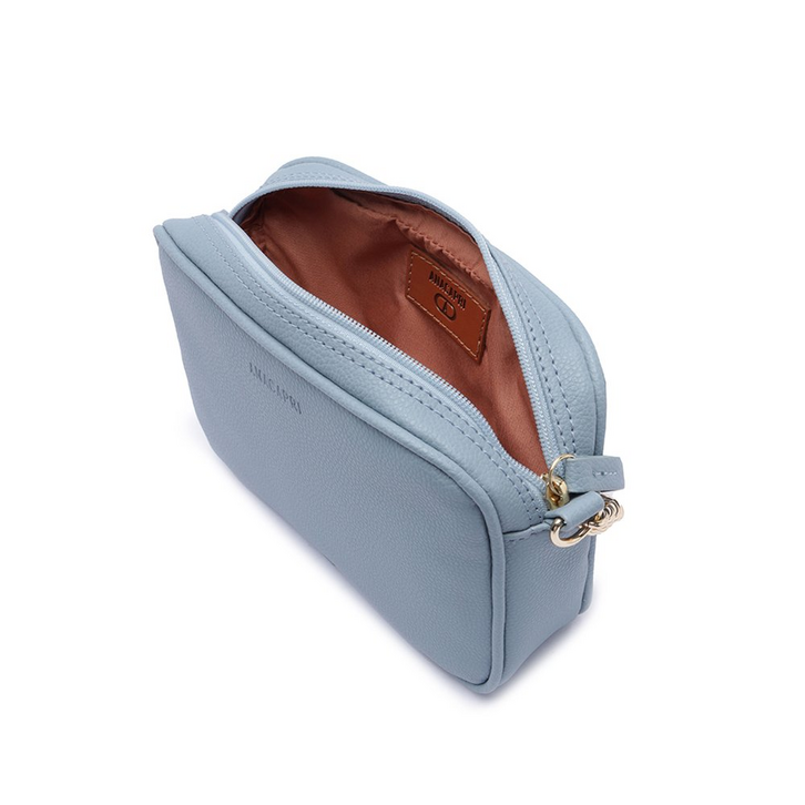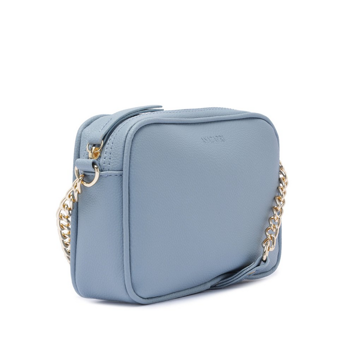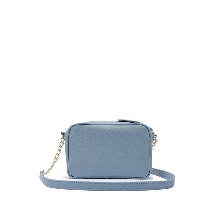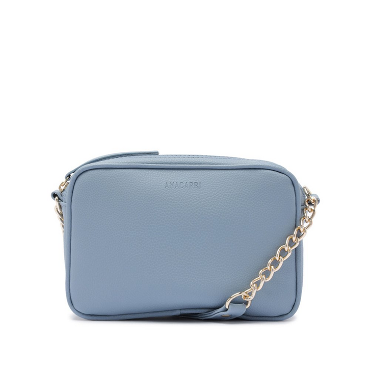 Bolsa tiracolo média, com alça de corrente, na cor azul. O modelo de material similar ao couro, possui efeito texturizado e shape retangular, com acabamento arredondado nos cantos. Estilo camera bag - apresenta detalhe de contorno em tira bombada. Possui alça longa transversal, com aplicação de correntaria metálica imponente. Apresenta forro em tom rosê, com aplicação de etiqueta emborrachada e personalizada Anacapri, na parte interna. Possui fecho superior em zíper, com puxador em tira fina. Traz assinatura Anacapri em relevo, centralizada na parte superior da capa frontal.