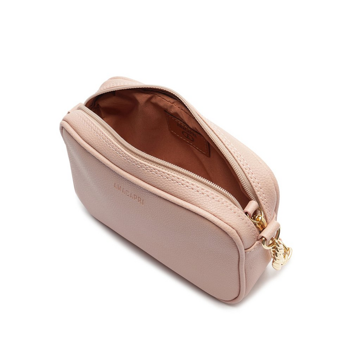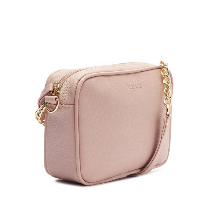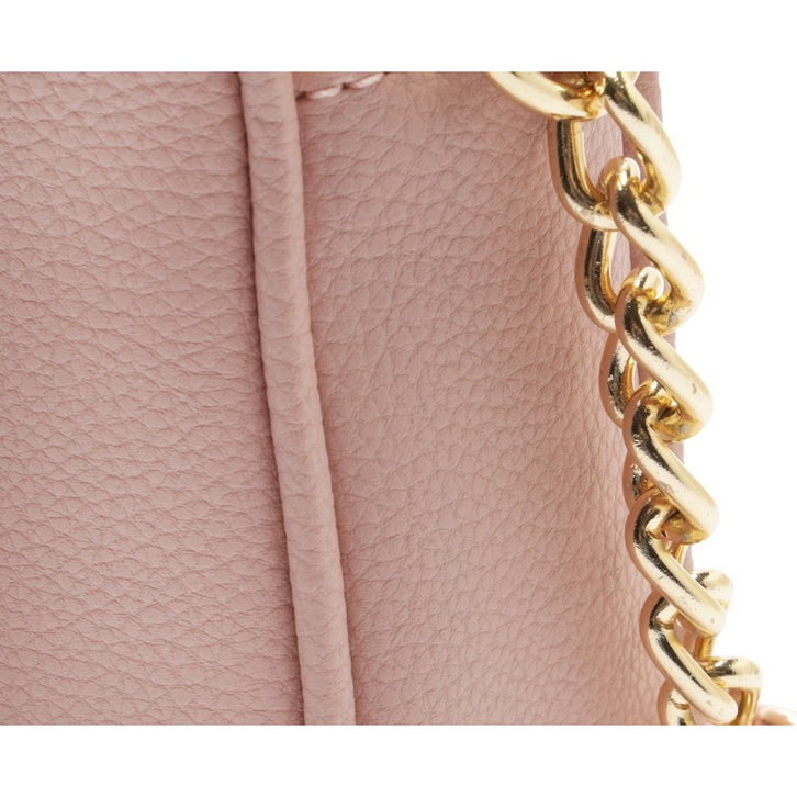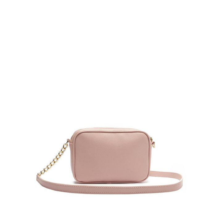 Bolsa Tiracolo Pequena Essencial Rosa Blush. Na cor rosa, possui alça longa à tiracolo e com detalhe de corrente dourada, além de abertura em zíper de metal. Contém gravação com o nome da marca na parte superior.
