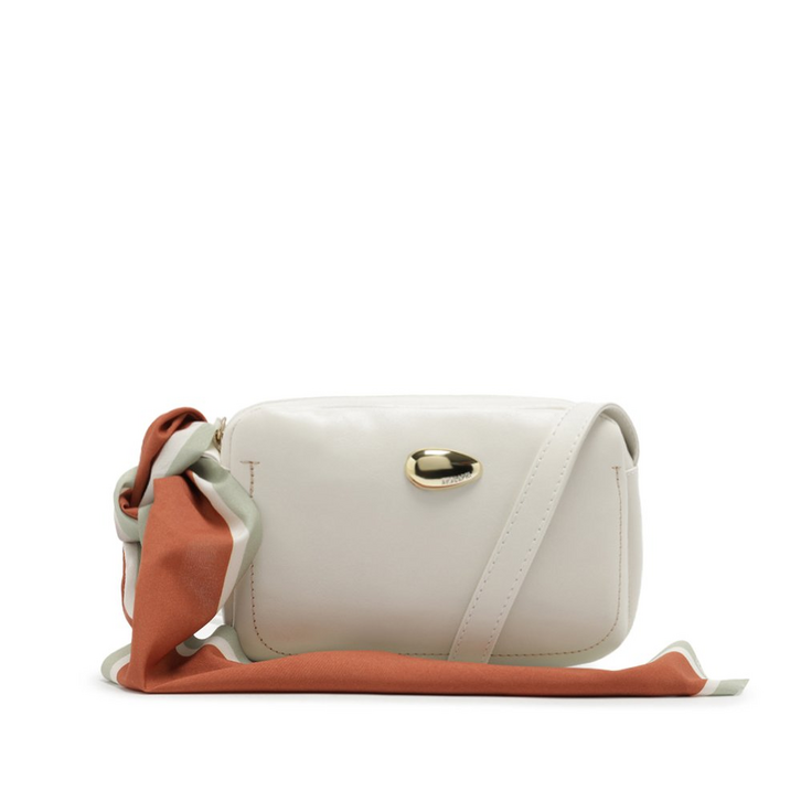 Bolsa tiracolo pequena, com lenço decorativo, na cor branca. O modelo de material similar ao couro com efeito texturizado, possui shape arredondado estilo camera bag. No tamanho P, traz alça longa transversal. Forrada, apresenta fecho superior em zíper. Traz aplicação de adorno imponente - metálico e personalizado - centralizado na parte superior da capa frontal, com detalhe em costura ornamental, no contorno inferior da peça. A bolsa tiracolo acompanha um lenço exclusivo e delicado com estampa personalizada Anacapri. O acessório é removível e pode ser utilizado separadamente da bolsa.