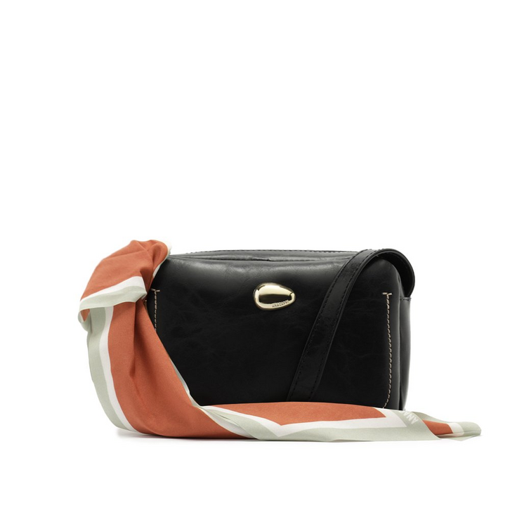 Bolsa tiracolo pequena, com lenço decorativo, na cor preta. O modelo de material similar ao couro com efeito texturizado, possui shape arredondado estilo camera bag. No tamanho P, traz alça longa transversal. Forrada, apresenta fecho superior em zíper. Traz aplicação de adorno imponente - metálico e personalizado - centralizado na parte superior da capa frontal, com detalhe em costura ornamental, no contorno inferior da peça. A bolsa tiracolo acompanha um lenço exclusivo e delicado com estampa personalizada Anacapri. O acessório é removível e pode ser utilizado separadamente da bolsa.