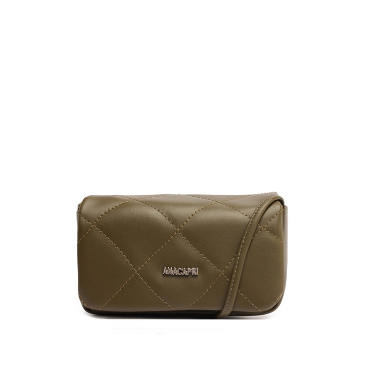 Bolsa tiracolo Anacapri estilo envelope pequena, com detalhe em costura matelassê, na cor verde. O modelo de material similar ao couro possui shape retangular, com acabamento em costura matelassê triangular na capa frontal. No tamanho P, traz alça longa transversal. Apresenta fecho em tampo com botão em ímã, estilo envelope. Na parte interna, traz forro especial colorido e etiqueta emborrachada com assinatura “descomplica” Anacapri. Possui aplicação de pin metálico com assinatura Anacapri centralizada na aba da capa frontal.