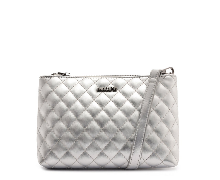 Bolsa tiracolo média em matelassê, na cor prateada. O modelo estruturado com shape retangular possui alça em tira transversal, regulável e removível por mosquetão. De material similar ao couro, apresenta detalhe em costura matelassê com design geométrico, na capa frontal. Com forro rosê, bolsinho com fecho em zíper exclusivo e etiqueta emborrachada Anacapri na parte interna. Possui fecho superior em zíper metálico com puxador exclusivo Anacapri. Traz aplicação de pin metálico com assinatura Anacapri, centralizado na parte inferior da capa frontal.
