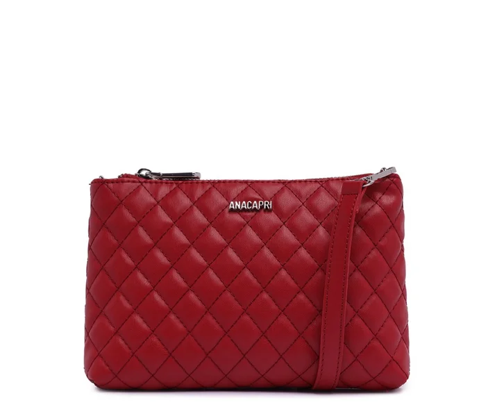 Bolsa tiracolo média em matelassê, na cor vermelha. O modelo estruturado com shape retangular possui alça em tira transversal, regulável e removível por mosquetão. De material similar ao couro, apresenta detalhe em costura matelassê com design geométrico, na capa frontal. Com forro rosê, bolsinho com fecho em zíper exclusivo e etiqueta emborrachada Anacapri na parte interna. Possui fecho superior em zíper metálico com puxador exclusivo Anacapri. Traz aplicação de pin metálico com assinatura Anacapri, centralizado na parte inferior da capa frontal.
