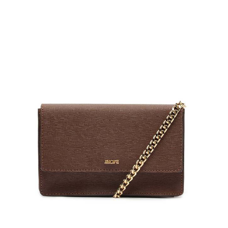 Bolsa tiracolo pequena e monocolor, na cor marrom. O acessório possui shape retangular e estruturado, em material similar ao couro, com acabamento a fio pintado. Traz alça transversal confeccionada em correntaria imponente. Possui fecho no tampo, por botão de ímã. Apresenta aplicação de pin metálico com assinatura Anacapri, centralizado na parte superior da capa frontal.