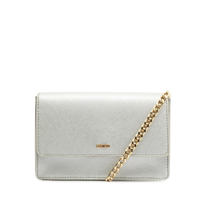 Bolsa tiracolo pequena e monocolor, na cor prateada. O acessório possui shape retangular e estruturado, em material similar ao couro, com acabamento a fio pintado. Traz alça transversal confeccionada em correntaria imponente. Possui fecho no tampo, por botão de ímã. Apresenta aplicação de pin metálico com assinatura Anacapri, centralizado na parte superior da capa frontal.