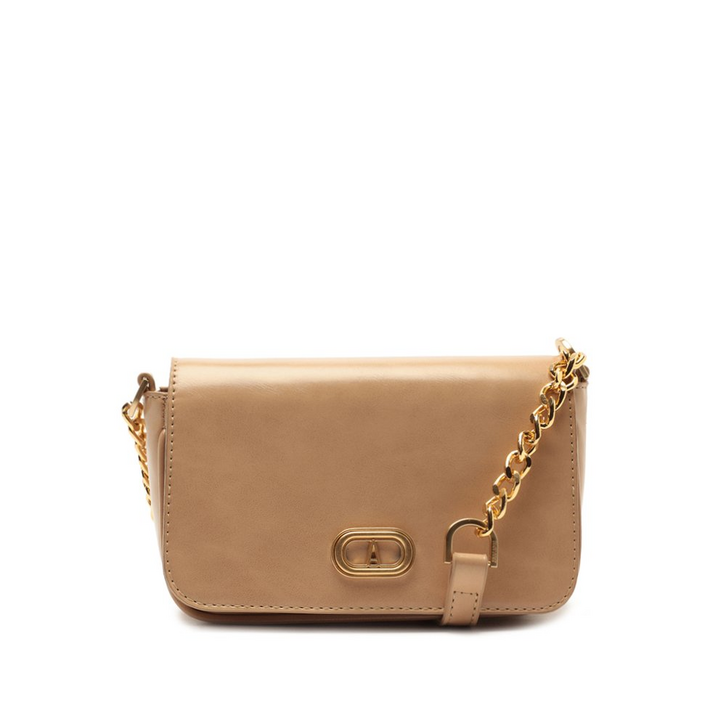 Bolsa tiracolo pequena, com alça de corrente, na cor bege. De material similar ao couro, o modelo tem formato retangular estilo envelope, laterais arredondadas e acabamento texturizado, com efeito natural. Traz alça longa transversal, com aplicação de correntaria metálica imponente. Possui fecho no tampo, por botão de pressão com ímã. Com forro interno em tom rosê, traz aplicação de maxi etiqueta Anacapri, com inscrição da frase: “Leve a vida numa bolsa”. Apresenta aplicação de pin metálico imponente - em banho especial tamboreado - em cápsula Anacapri, centralizada na parte inferior do tampo, na capa frontal. A bolsa traz espelho interno, na contracapa.