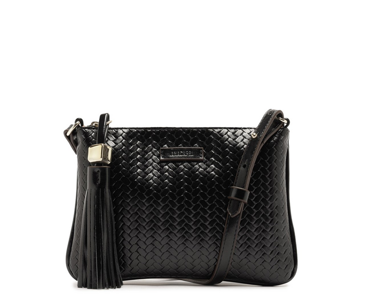 Bolsa tiracolo pequena preta, em material similar ao couro. O modelo possui shape estruturado com acabamento a fio. A parte frontal traz textura tramada, enquanto a parte traseira é lisa. Com tag de assinatura Anacapri aplicada no topo da capa. Vem com bag charm removível em barbicacho, com dado metalizado em detalhe. Possui alça tiracolo fina, removível e regulável, permitindo diferentes formas de uso. Fechamento superior em zíper. Na parte interna, apresenta forro em tom rosé, bolso flat funcional e etiqueta personalizada com a frase “Leve a vida numa bolsa”.