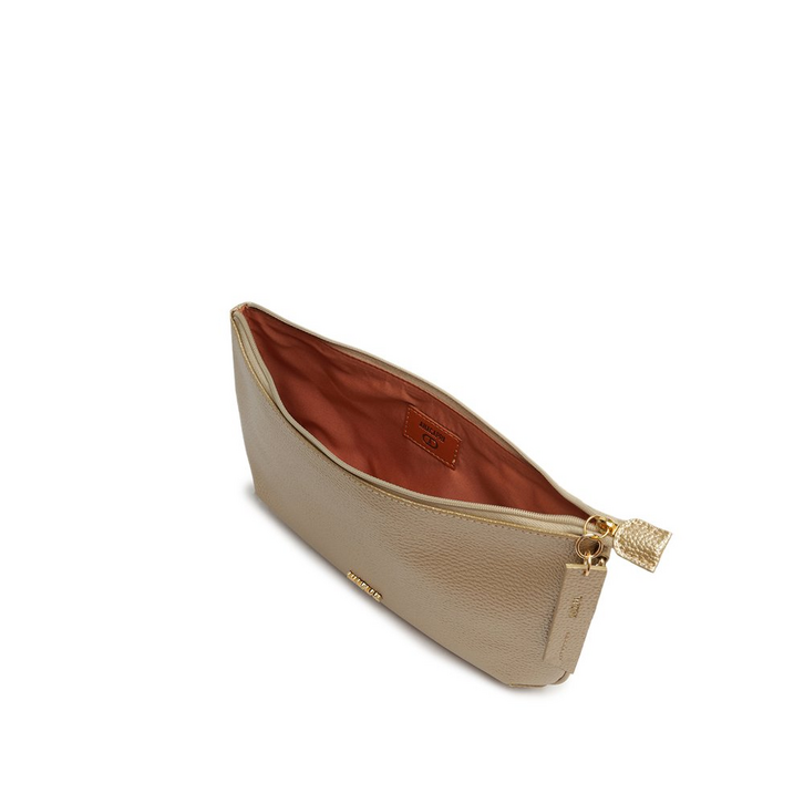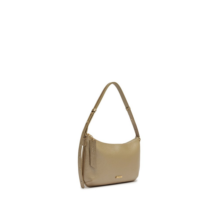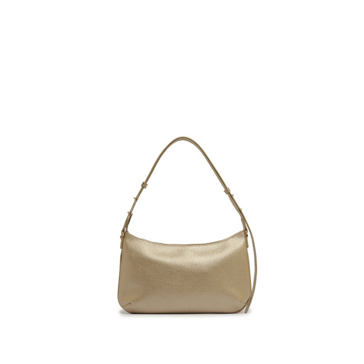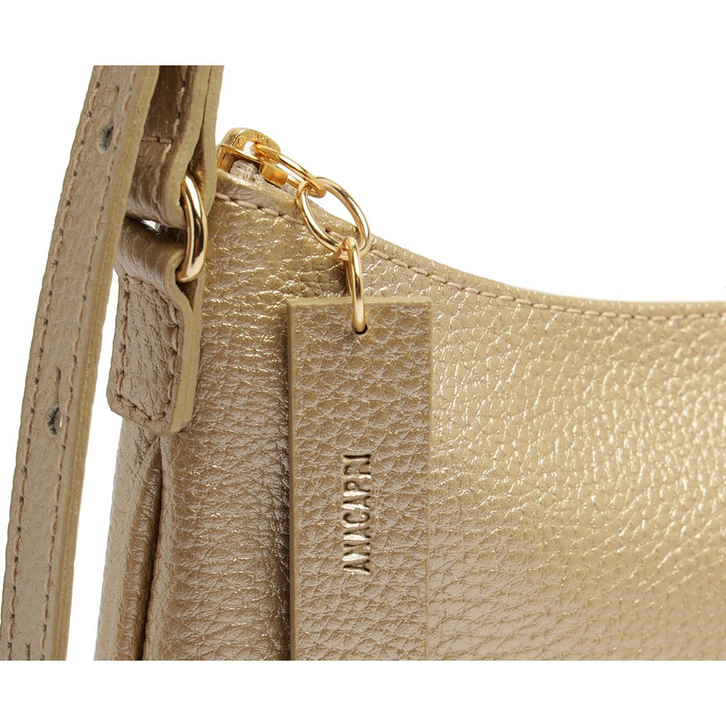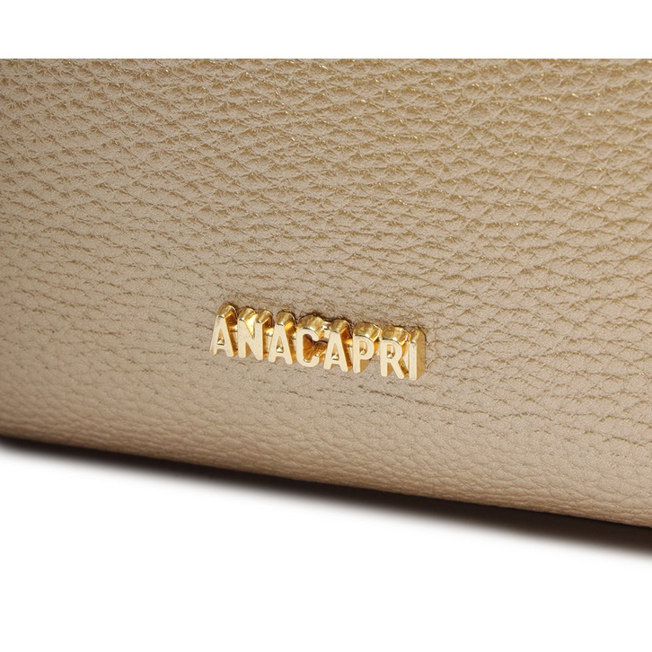 Bolsa tiracolo média, com detalhe em textura, na cor dourada. O modelo de material similar ao couro possui shape retangular, com efeito texturizado por toda a peça. No tamanho P, traz alça de ombro longa - fixa e com várias opções de regulagem. Apresenta fecho superior em zíper, com puxador em tira mais grossa e texturizada, com assinatura Anacapri em carimbo metálico. Na parte interna, traz forro especial colorido e etiqueta emborrachada exclusiva Anacapri. Com aplicação de pin metálico Anacapri, centralizado na parte inferior da capa frontal.