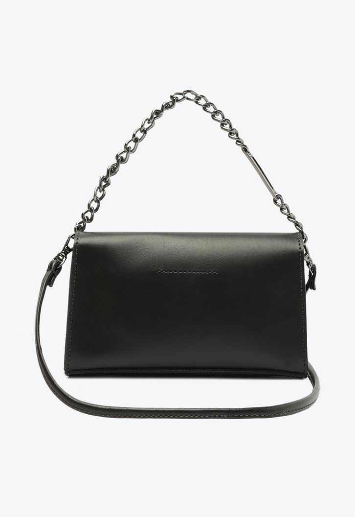 Bolsa tiracolo Anacapri preta Lisa. O modelo de tamanho P possui shape mais estruturado. De material similar a couro soft, traz capas lisas, com alça longa transversal removível e regulável - com detalhe em corrente em metal personalizada e exclusiva, com aplicação de aviamento retangular metalizado com inscrição do nome da marca. Forrada na parte interna, com fecho em tampo. Aplicação de aviamento metalizado com ícone “A” - assinatura Anacapri - na parte inferior da capa frontal.
