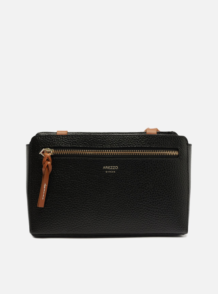 Bolsa tiracolo pequena preta. O modelo tem formato retangular, laterais retas e acabamento texturizado. Traz alça lateral marrom, regulável e com detalhe manual trançado na base. Possui fecho em zíper e puxador. Com nome da marca na capa e bolso externo frontal com zíper e puxador em tira marrom.