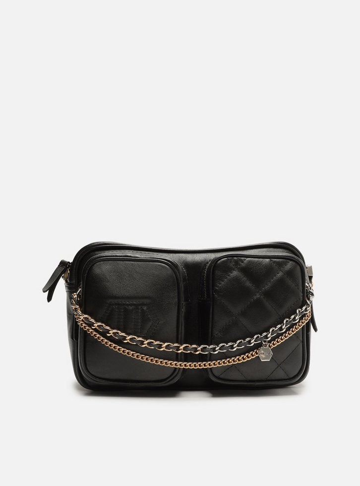 Bolsa tiracolo média preta de couro. O modelo tem formato retangular e estruturado. Traz alça em tira de couro regulável, conectada a correntes na base. Possui fecho superior em zíper e puxador. Traz bolsos externos frontais, um com costura do ID da marca e o outro com matelassê, ambos com fecho em zíper. Com correntes extras bicolores e pingente da marca.