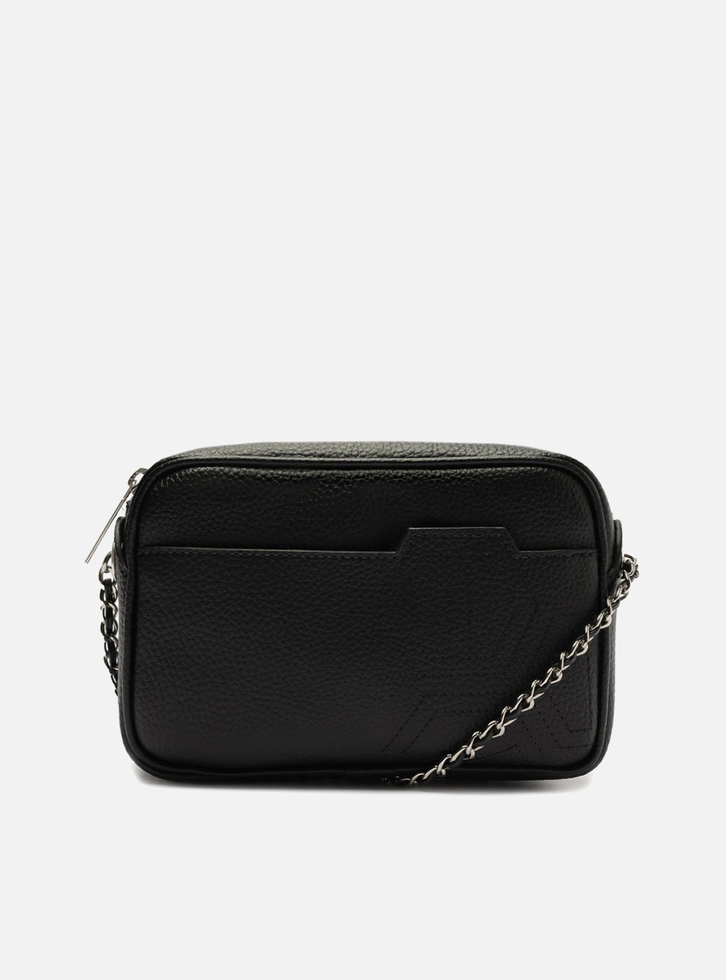 Bolsa tiracolo pequena preta. O modelo tem formato retangular, laterais arredondadas e acabamento texturizado. Traz alça lateral em corrente com detalhes e fecho em zíper e puxador. Com bolso externo frontal e costuras pesponto geométricas na capa.