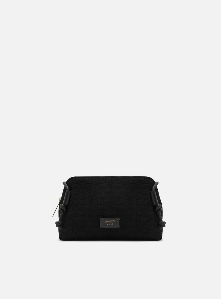 Bolsa tiracolo pequena em camurça preta. O acessório tem formato estruturado e acabamento texturizado que remete ao tressê. Traz alça em tiras finas rolotês, sendo uma superior e duas laterais, presas por nós. Possui fecho em zíper com puxador. Com tag da cor da bolsa e nome da marca na capa.
