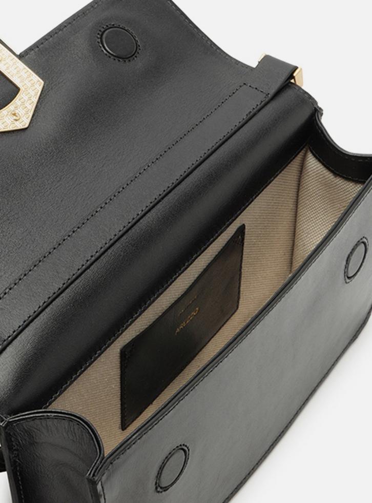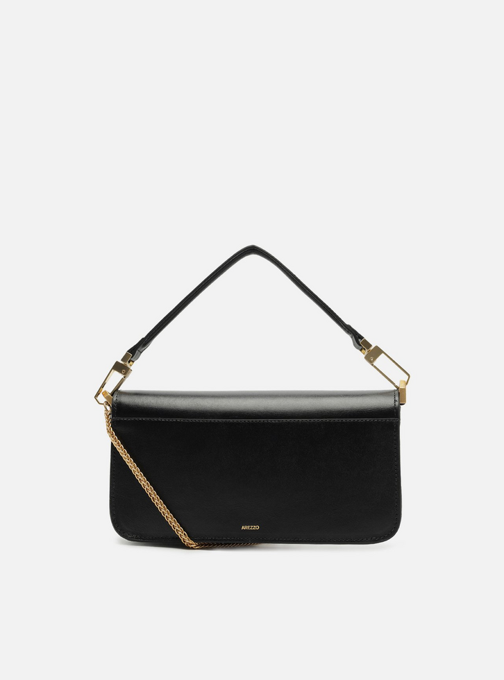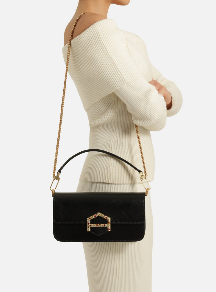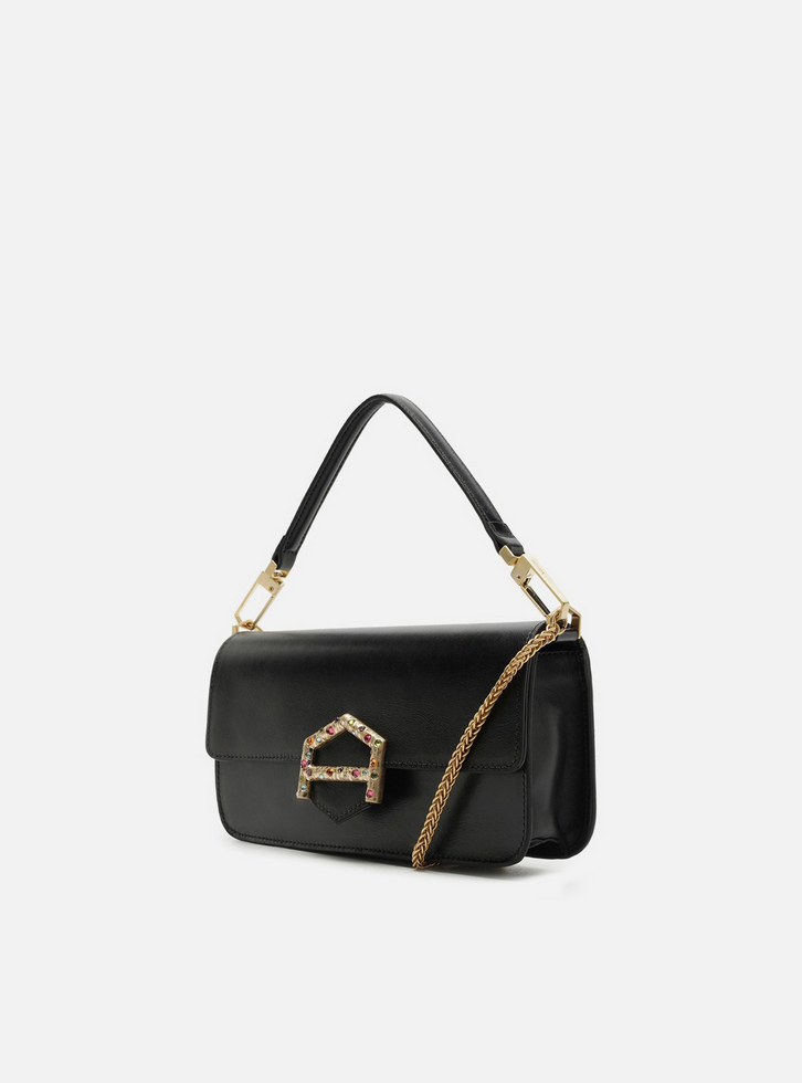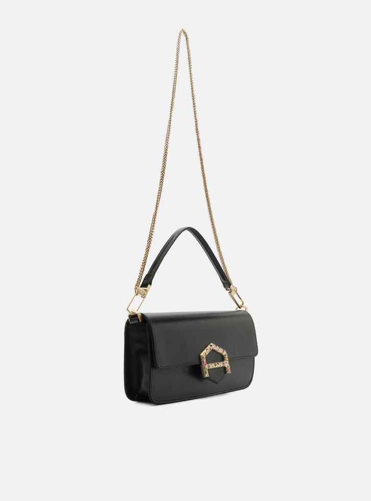 Bolsa tiracolo média em couro preta. O acessório tem formato estruturado e retangular, estilo baguete, e laterais arredondadas. Traz alça tiracolo em corrente dourada fina e removível e alça curta em tira larga, presa por ganchos imponentes. Com fecho em tampo frontal e imãs internos, além de tala com detalhe em peça metálica vazada com formato de A geométrico e aplicação de pedras coloridas. Apresenta forro e bolso interno.