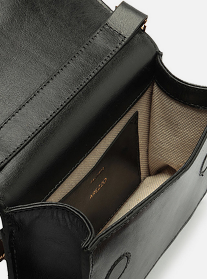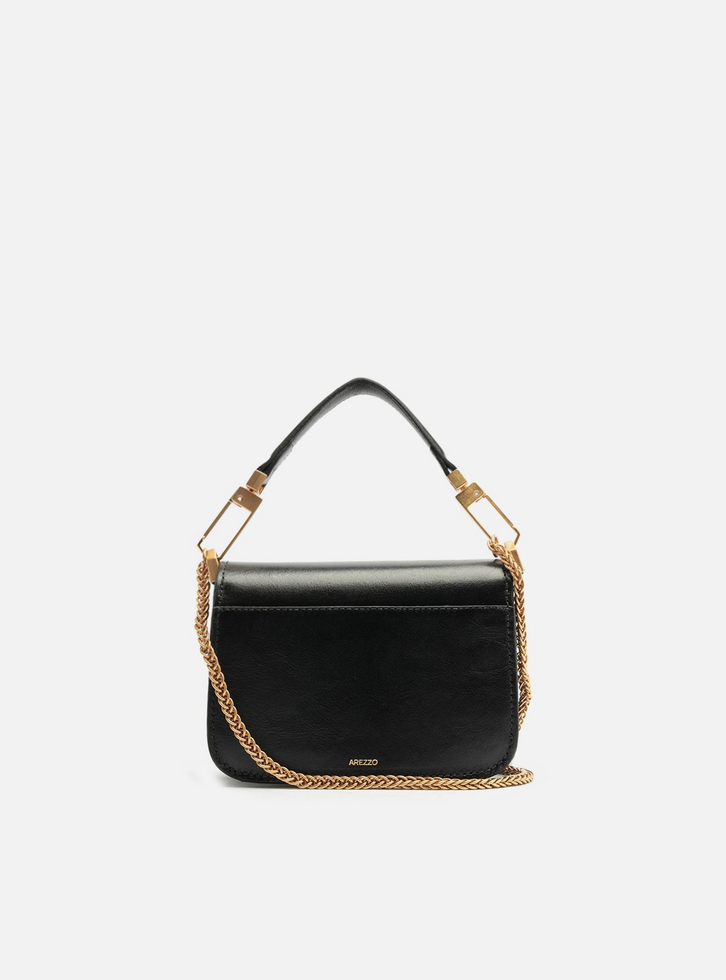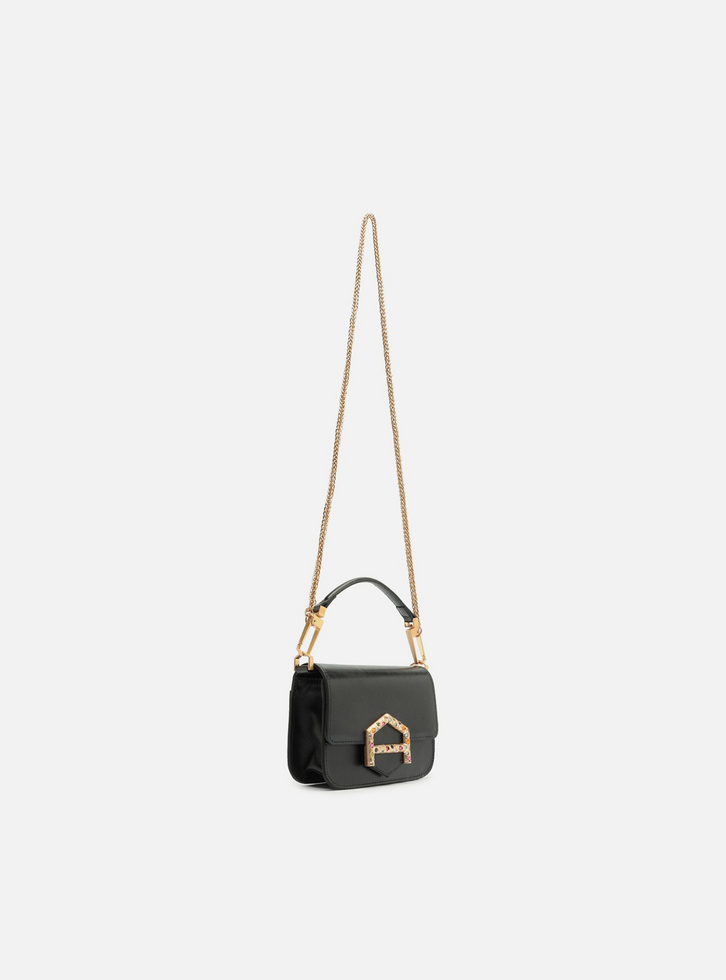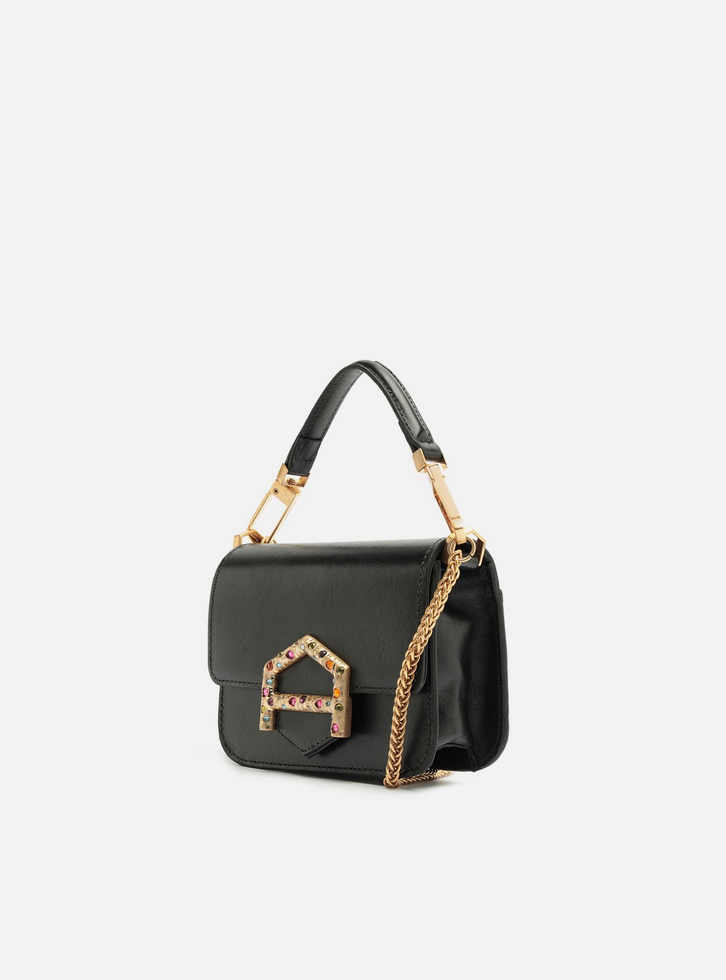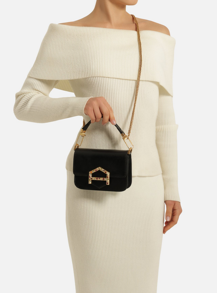 Bolsa tiracolo pequena em couro preta. O acessório tem formato estruturado e quadrado e laterais arredondadas. Traz alça tiracolo em corrente dourada fina e removível e alça curta em tira larga, presa por ganchos imponentes. Com fecho em tampo frontal e imãs internos, além de tala com detalhe em peça metálica vazada com formato de A geométrico e aplicação de pedras coloridas. Apresenta forro e bolso interno.