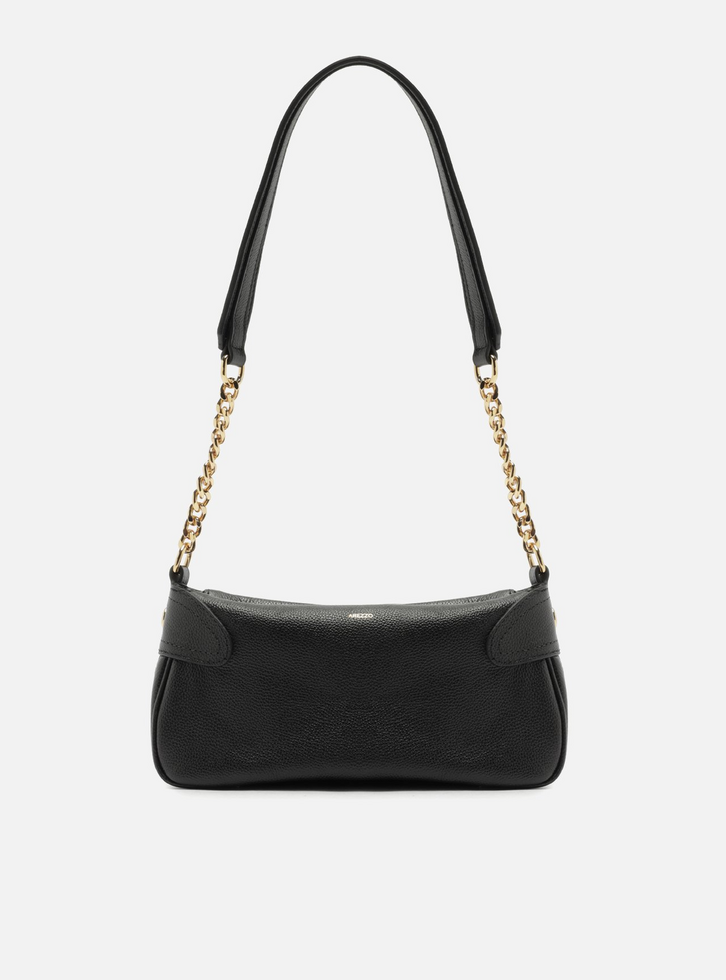 Bolsa tiracolo média preta em couro. O acessório tem formato estruturado e laterais arredondadas. Traz alça longa com parte em corrente metálica dourada e parte em couro ajustável. Possui fecho superior em zíper com puxador e inscrição discreta do nome da marca na parte frontal. Detalhe em tiras e botão de metal nas laterais.