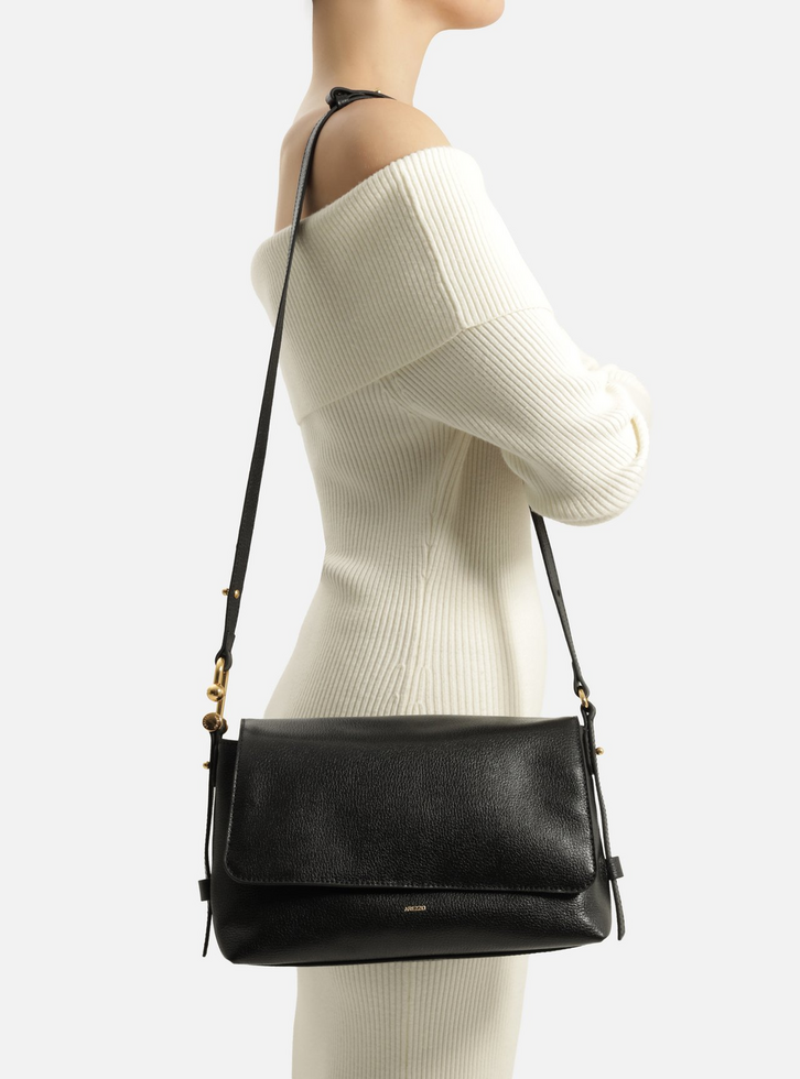 Bolsa tiracolo média em couro preta. O acessório tem formato retangular e acabamento macio. Traz alça tiracolo regulável, presa por metais, sendo um deles aberto, e com tiras nas laterais. Possui fecho em tampo e imãs internos.