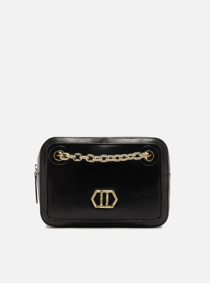 Bolsa feminina tiracolo média em couro preto com efeito desgastado. O acessório tem formato quadrado e estruturado, com acabamento levemente brilhante. Possui fecho superior em zíper e alça em tira de couro e corrente metálica, que passa pela capa e interior, saindo na parte traseira por ilhoses. Conta com moldura e detalhe frontal em metal geométrico vazado.