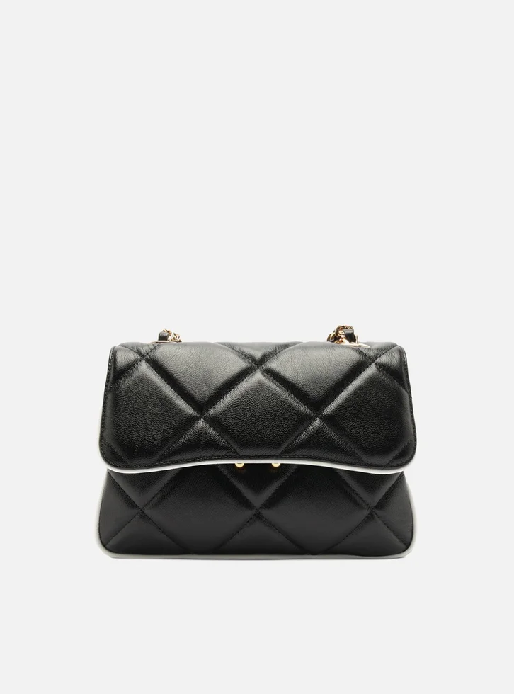 Bolsa tiracolo média de couro preta com contorno branco. O acessório tem formato estruturado, capa frontal e tampo com costuras em matelassê e inscrição discreta do nome da marca, além de capa traseira lisa. Traz alça em corrente metálica dupla com tiras de couro entrelaçadas e ombreiras, presa à bolsa na parte superior por metais vazados. Possui fecho em tampo frontal e encaixe em peça metálica. Com forro e divisória interna.