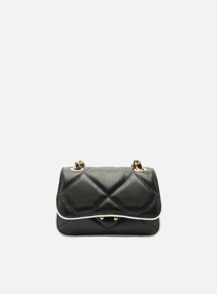 Bolsa tiracolo pequena de couro preta com contorno branco. O acessório tem formato estruturado, capa frontal e tampo com costuras em matelassê e inscrição discreta do nome da marca, além de capa traseira lisa. Traz alça em corrente metálica dupla com tiras de couro entrelaçadas e ombreiras, presa à bolsa na parte superior por metais vazados. Possui fecho em tampo frontal e encaixe em peça metálica. Com forro e divisória interna.