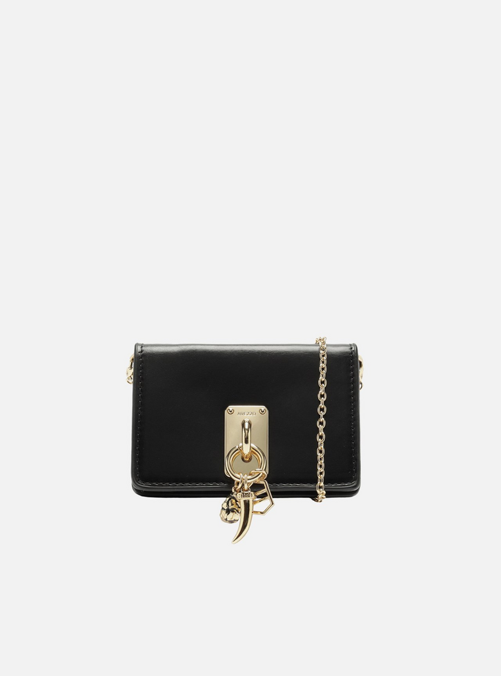 Bolsa tiracolo pequena preta em couro. O acessório tem formato estruturado e acabamento texturizado. Traz fecho frontal em tampo com ímã interno e alça em corrente metálica fina removível. O destaque fica por conta da peça de metal com charms variados na capa frontal.