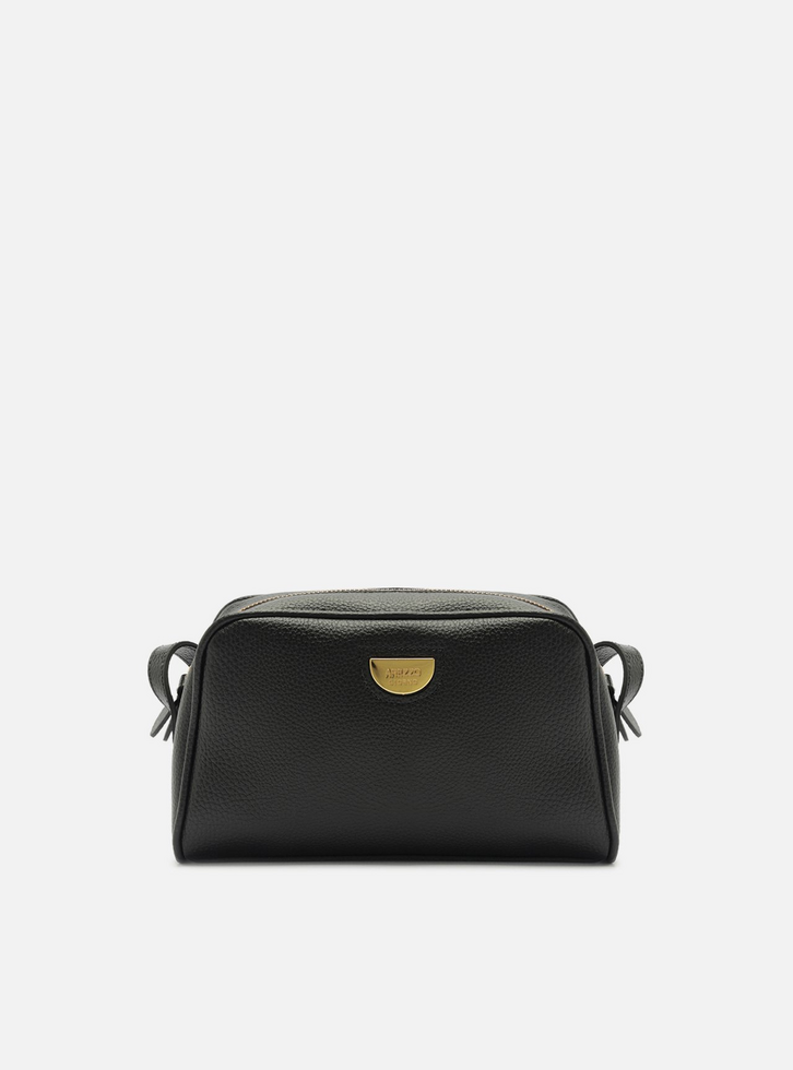 Bolsa feminina tiracolo média preta. O acessório tem formato retangular, laterais arredondadas e acabamento texturizado. Possui alça lateral fina em tira regulável por carrapeta. Traz fecho em zíper com puxador. Com tag em metal do nome da marca na capa.