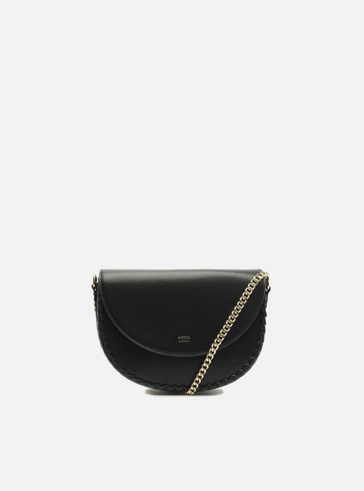 Bolsa tiracolo pequena preta. O acessório tem formato estruturado e laterais arredondadas. Possui alça lateral em corrente metálica e fecho em tampo frontal com ímãs internos. Traz detalhe com inscrição do nome da marca aplicada na parte frontal.