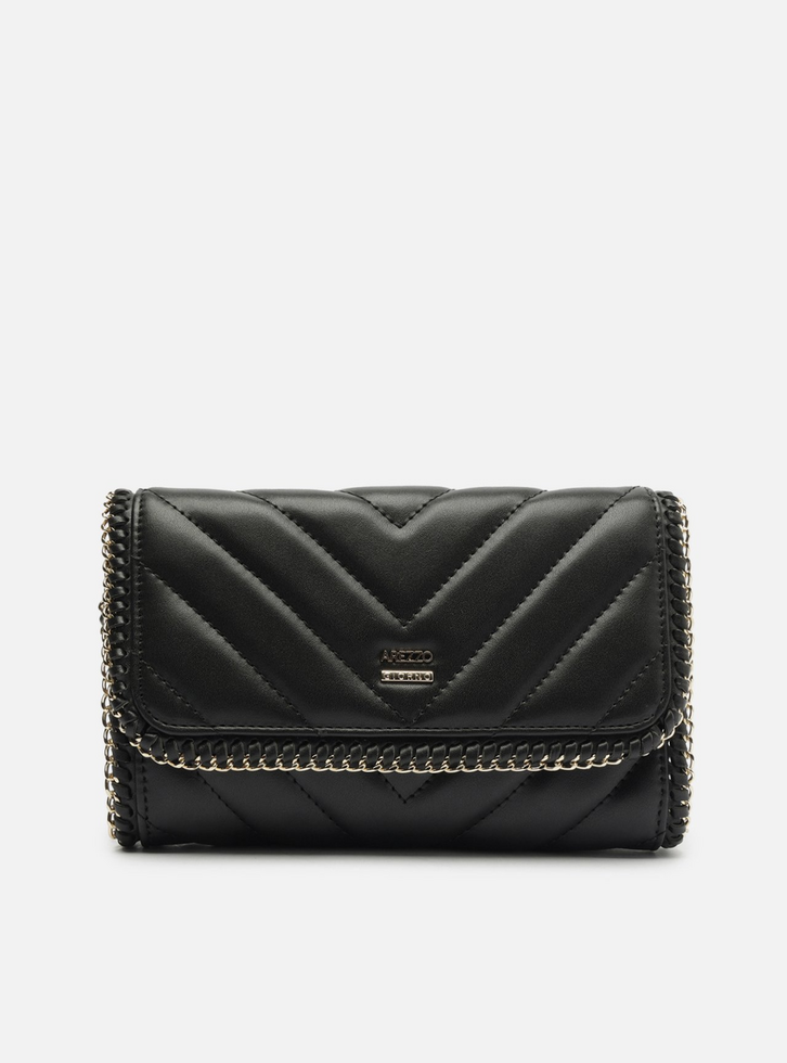 Bolsa tiracolo pequena preta. O acessório tem formato estruturado e retangular e costuras em matelassê. Traz alça em corrente metálica, presa à bolsa. Possui fecho em tampo frontal e peça metálica com inscrição do nome da marca na capa.