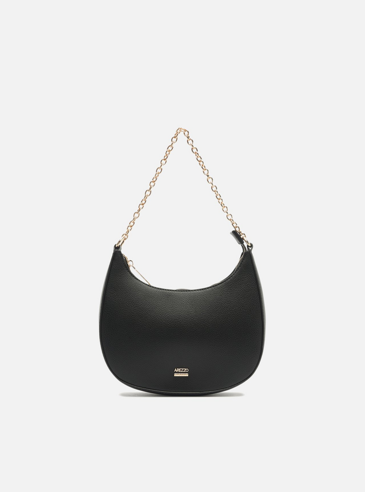 Bolsa feminina tiracolo pequena preta. O acessório tem formato meia-lua e estrutura maleável, com acabamento granulado e toque macio. Possui alça de ombro em corrente metálica e fecho superior em zíper. Traz inscrição do nome da marca na parte frontal em metal dourado.