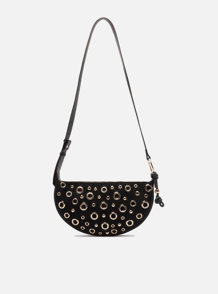 Bolsa feminina tiracolo média com formato meia-lua, em suede preto de toque macio. O acessório possui aplicação de múltiplos ilhoses metálicos dourados em diferentes tamanhos. Possui alça longa de ombro ajustável, em material liso, presa por fivelas metálicas e detalhe de nó lateral. Com fecho superior em zíper.