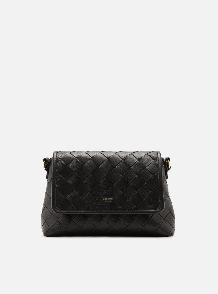 Bolsa feminina tiracolo média preta. O acessório tem formato estruturado e acabamento em tressê. Possui alça lateral longa com regulagem, fecho em tampo frontal com imãs internos e moldura lisa. Tag do nome da marca aplicada na capa frontal.