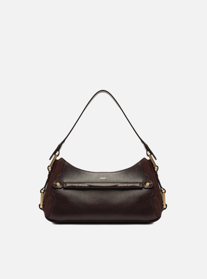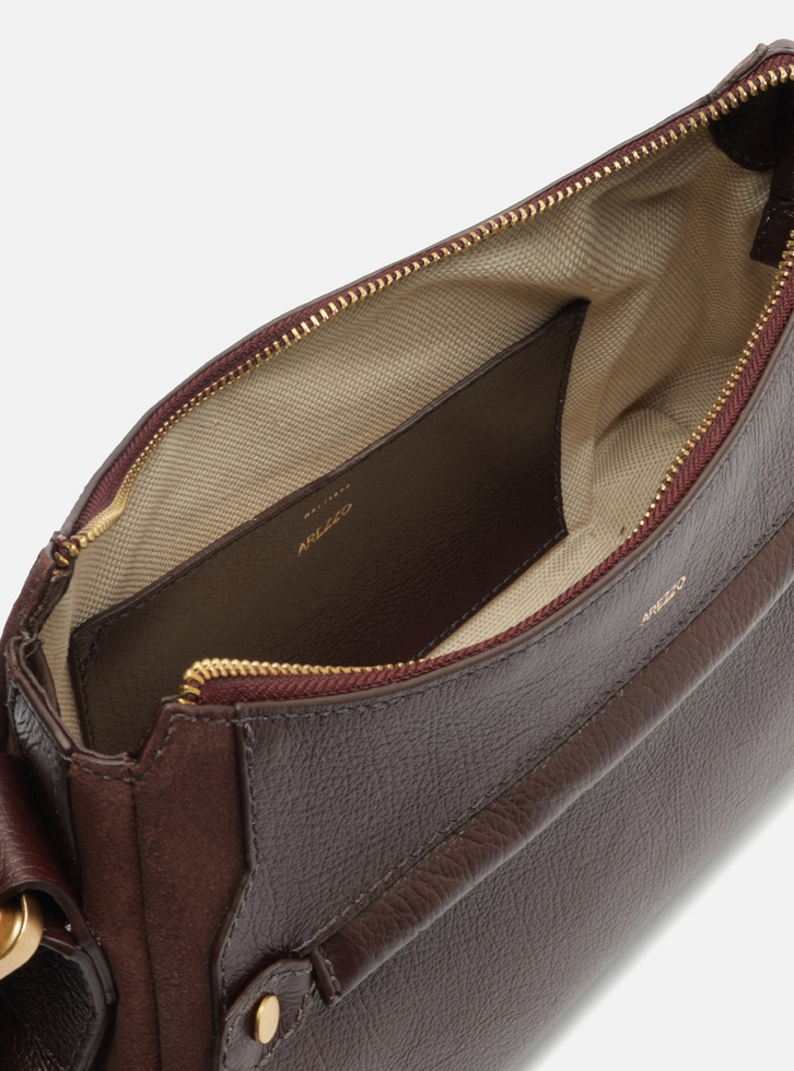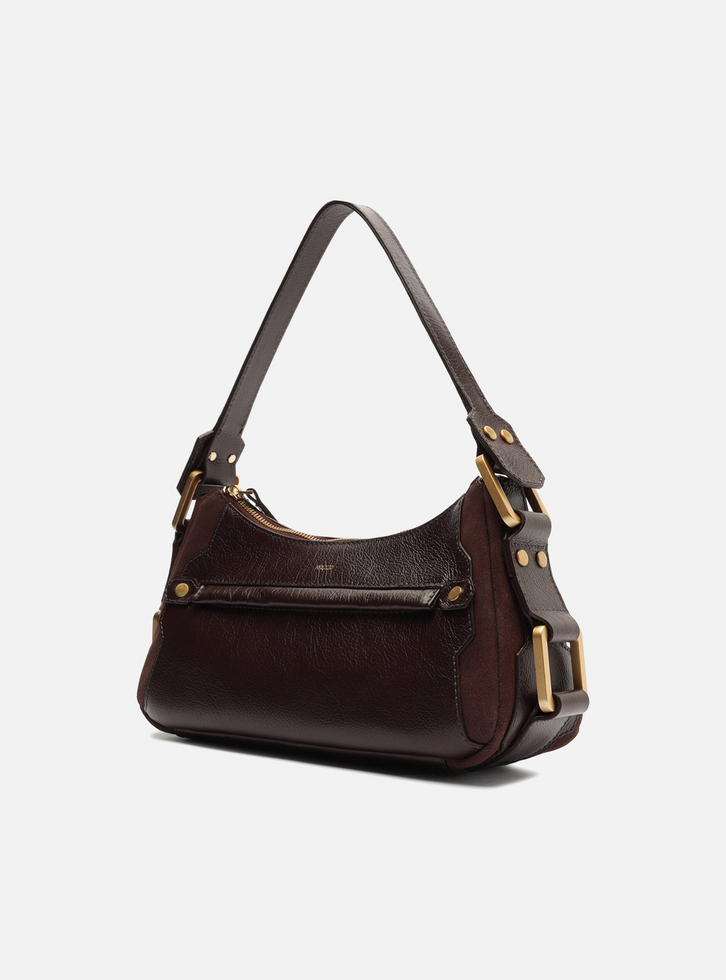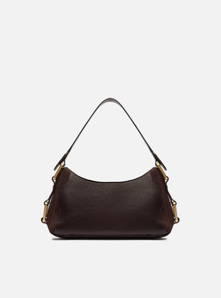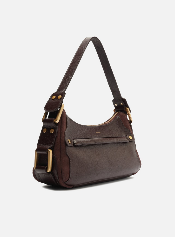 Bolsa tiracolo média em couro e camurça vermelho. O acessório tem formato retangular, acabamento desgastado, recortes nas capas e aplicações em camurça. Traz alça de ombro presa por tiras largas sobre as capas, nas laterais, com metais imponentes. Com fecho superior em zíper e puxador em tira. Possui bolso externo frontal com fecho em zíper.