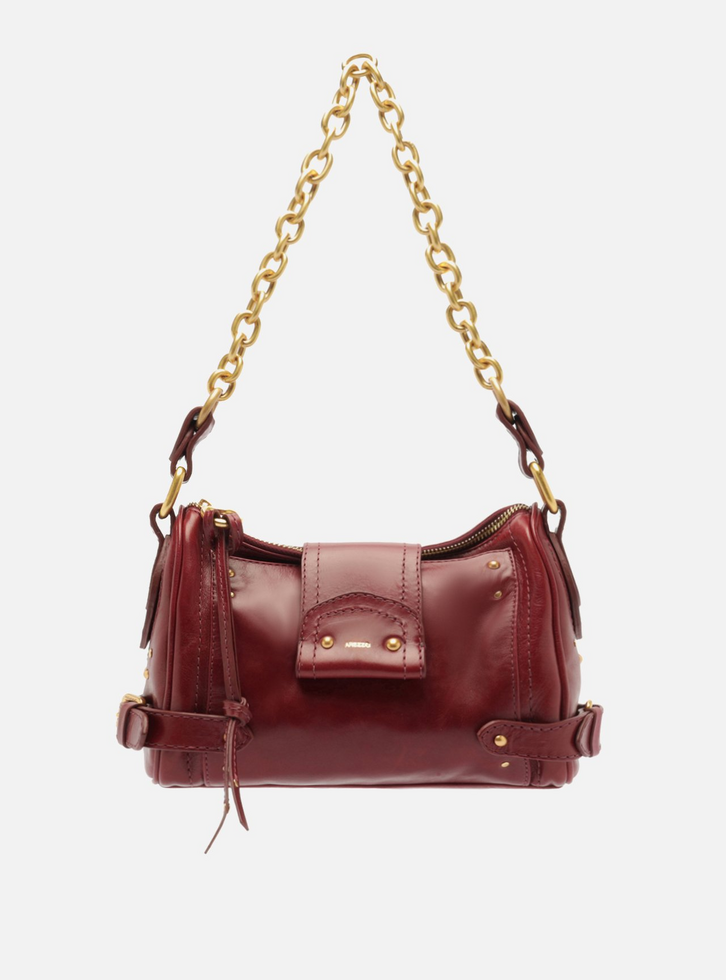 Bolsa feminina tiracolo média de couro bordô. O acessório tem formato estruturado, acabamento liso e laterais arredondadas com detalhe em tiras afiveladas. Traz alça tiracolo longa, regulável e removível e tira curta em corrente metálica dourada, presa por argolas e peças de couro. Fecho em zíper e puxador em tira, além de bolso externo frontal e tira larga sobreposta. Com aplicação de rebites dourados por toda a bolsa.