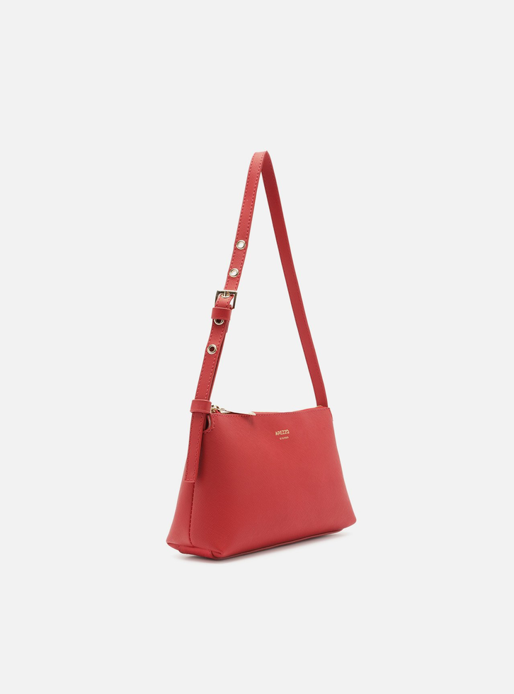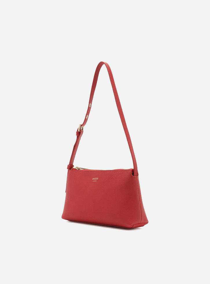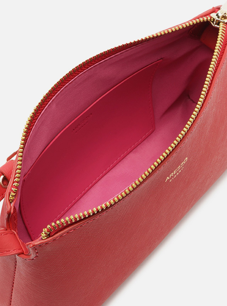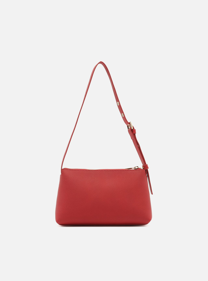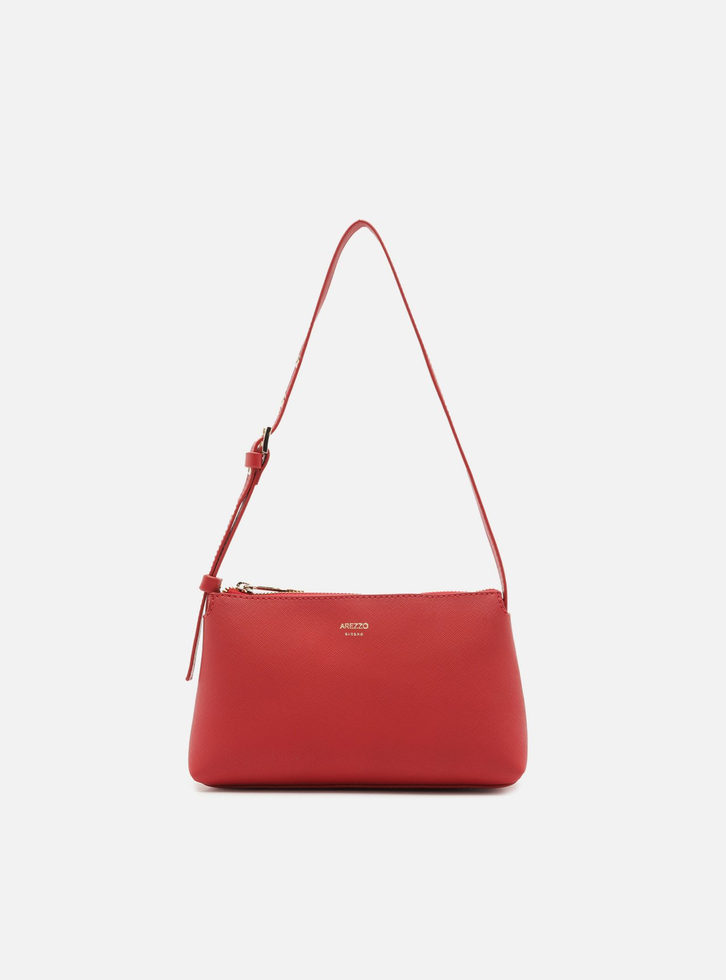 Bolsa tiracolo pequena vermelha. O acessório tem formato retangular, laterais arredondadas e acabamento texturizado. Traz alça de ombro em tira fina com regulagem por fivela. Possui fecho em zíper e puxador metálico. Com inscrição do nome da marca na capa.