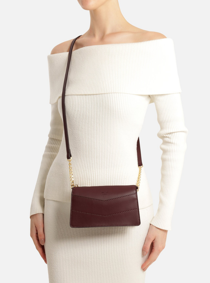 Bolsa tiracolo pequena vinho. O acessório tem formato estruturado, acabamento liso e inscrição discreta do nome da marca. Traz alça tiracolo fina com regulagem e correntes metálicas. Com fecho superior em zíper e puxador em tira. Com detalhe em costuras na capa.
