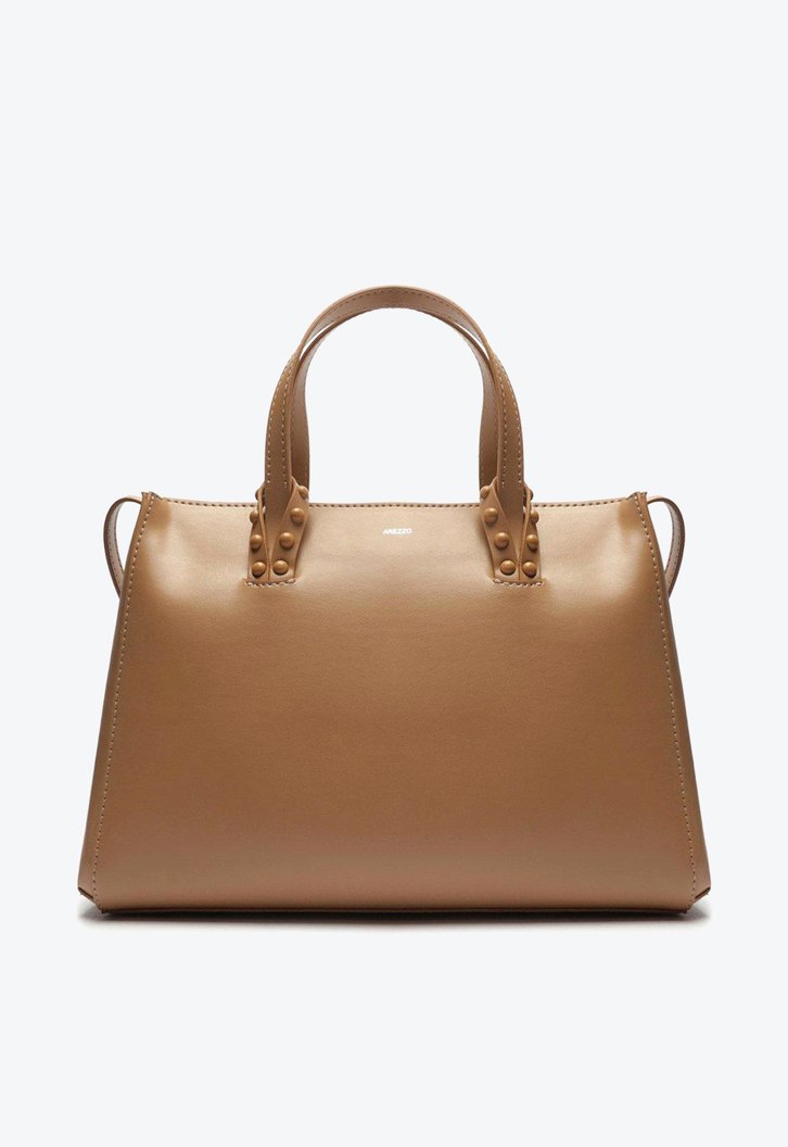 Bolsa tote grande marrom. O modelo tem formato estruturado, laterais arredondadas e acabamento acetinado e macio. Possui alça tiracolo em tira fina regulável, duas alças de mão em tiras finas e porta-alças com aplicação de spikes da cor da bolsa. Com fecho superior em zíper, puxador em tira e inscrição do nome da marca na capa frontal.