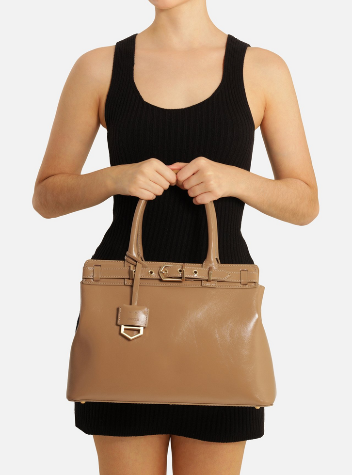 Bolsa tote grande de couro bege. O acessório tem formato estruturado, laterais arredondadas e acabamento liso. Traz duas alças de mão e fecho superior em zíper com puxador em tira. Com recorte superior e detalhe em tira com passador e fivela, que se assemelha a um cinto, além de bag charm removível em metal com assinatura discreta do nome da marca.