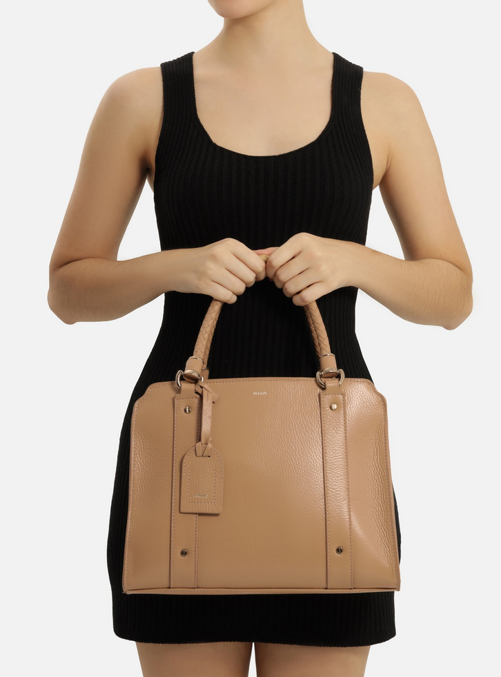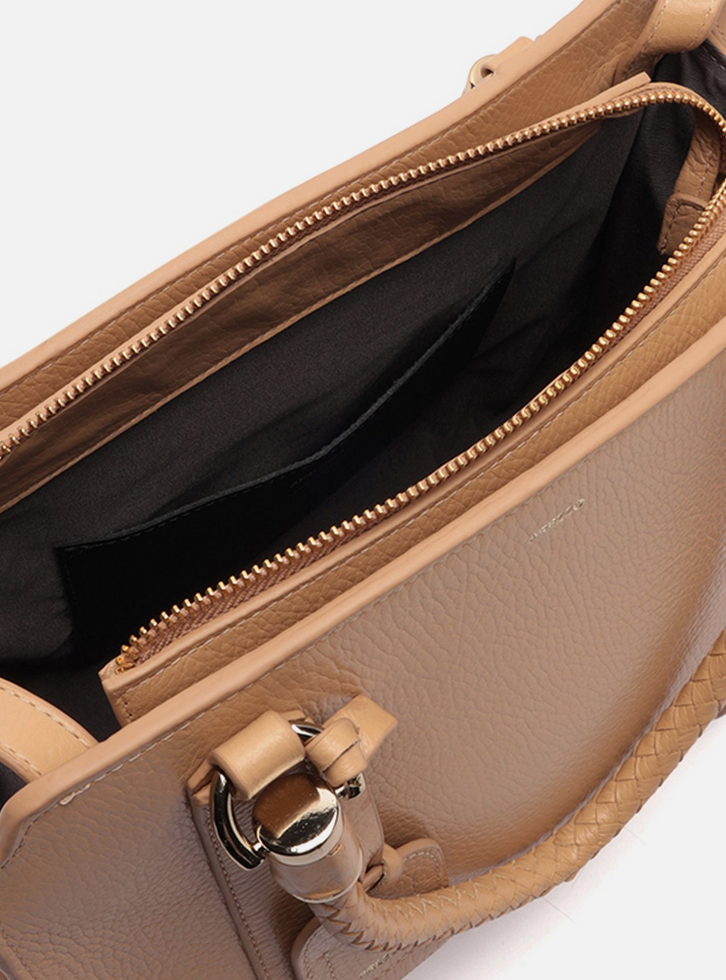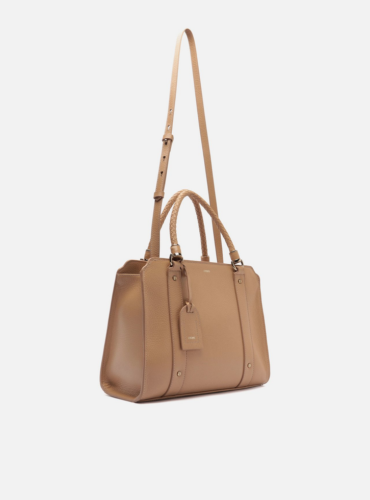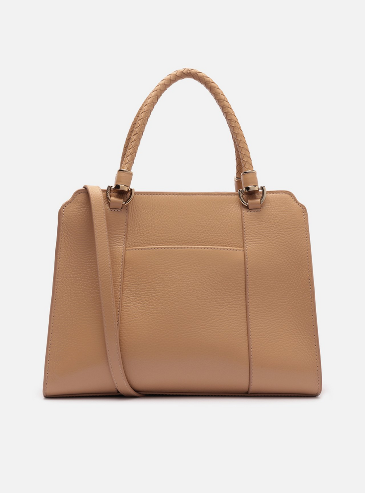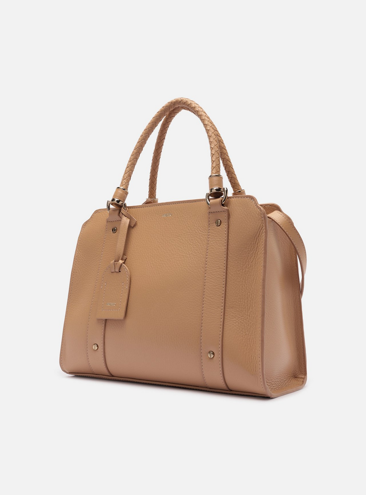 Bolsa tote grande de couro bege. O acessório tem formato estruturado, acabamento texturizado e tiras sobre a capa frontal com rebites. Traz alça tiracolo fina com regulagem e alças de mão em tramado manual, presas por ilhoses metálicos. Possui fecho superior em zíper e puxador. Com forro e bolso externo traseiro. Acompanha bag charm preso por tira a uma das alças.